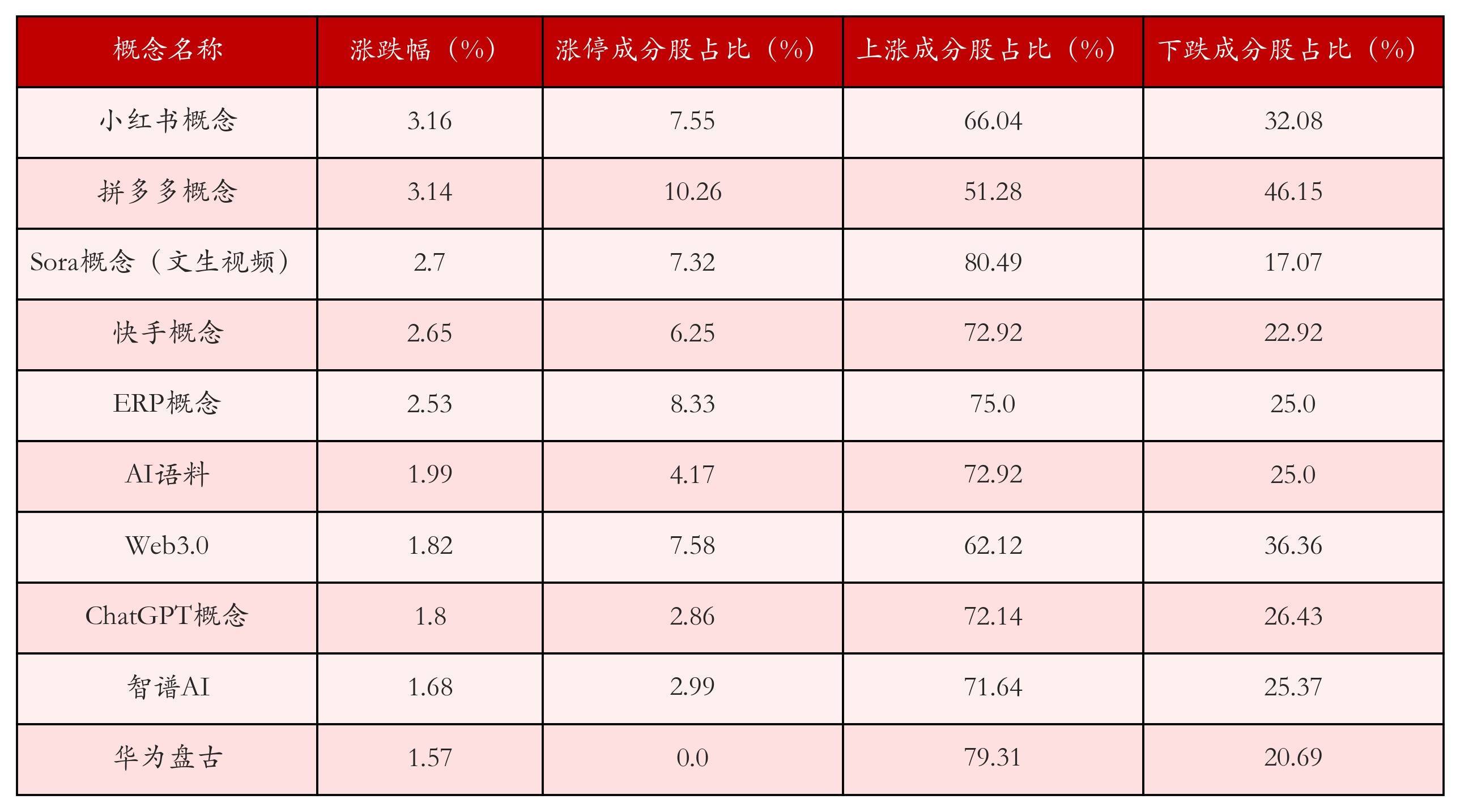 根据A股概念涨跌幅与所对应的股票池综合分析,涨幅靠前的三个概念板块分别为:小红书概念、拼多多概念与Sora概念(文生视频)。排名前10位的概念板块相关数据见下表:
