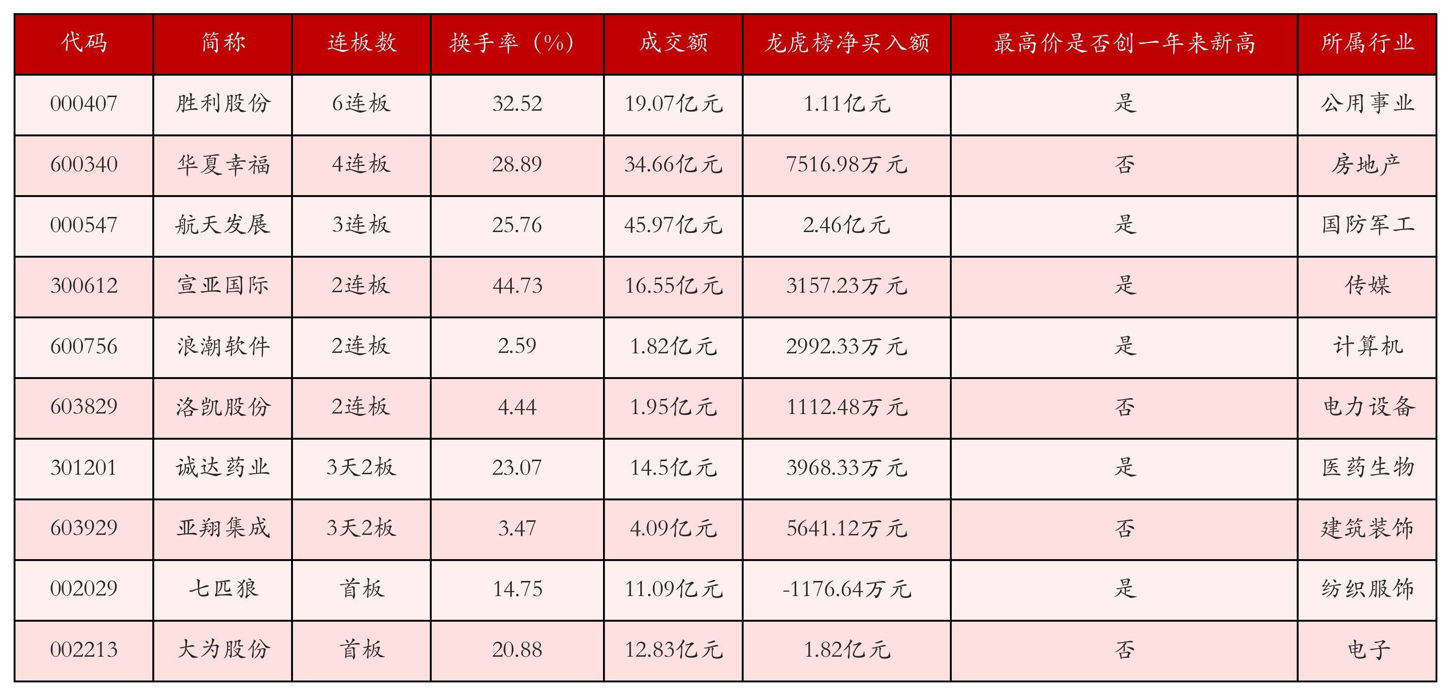 截至11月18日收盘,上证综指下跌0.81%,收于3939.81点,深证成指下跌0.92%,收于13080.49点,创业板指下跌1.16%,收于3069.22点。今日沪深两市A股共计63只涨停,综合当前连板数以及当日龙虎榜数据股票配资开户费用,其中较为强势的前三只个股分别为:胜利股份(000407)、华夏幸福(600340)与航天发展(000547)。今日强势个股前10位具体数据见下表: