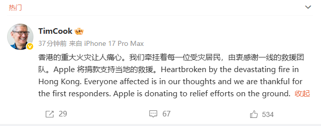 股票配资开户费用 库克称对中国香港火灾感到痛心: 苹果公司将捐款支持当地救援